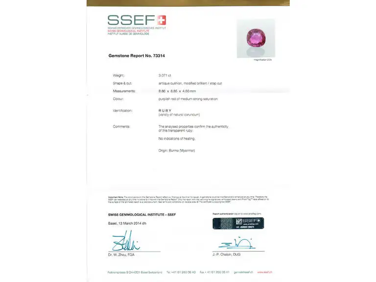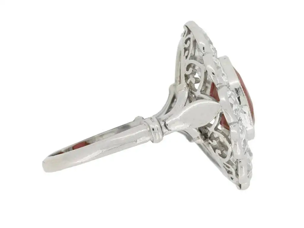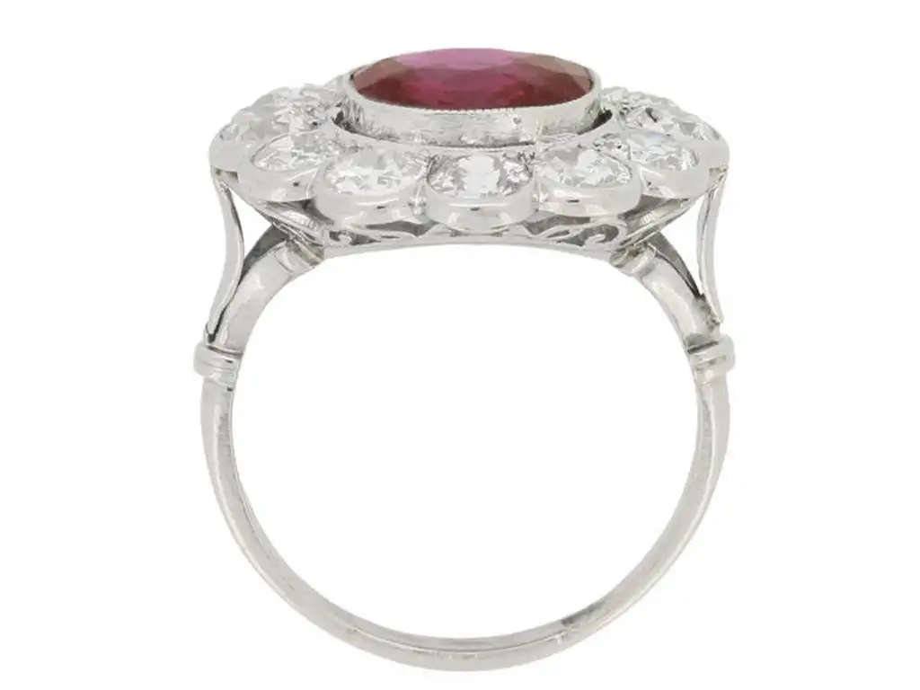 Burmese ruby and diamond cluster ring. Set to centre with a cushion shape old cut natural unenhanced Burmese ruby with an approximate weight of 3.07 carats, in an open back rubover millegrain setting, encircled by a single row of twelve round old cut diamonds in open back grain and rubover millegrain settings with an approximate combined weight of 2.40 carats, to an elegant scalloped openwork cluster with an ornate scrolling pattern motif gallery and intricate pierced backholing, flanked by fleur de lis scrolling shoulders, flowing down to a solid D-shape shank. Tested platinum, circa 1910, accompanied by Swiss Gemmological Institute (SSEF) report #73314. UK finger size N.