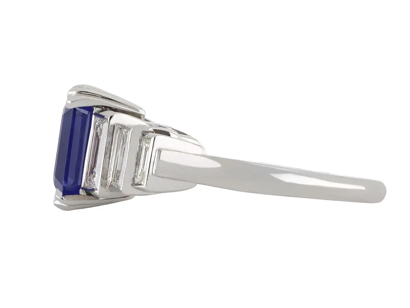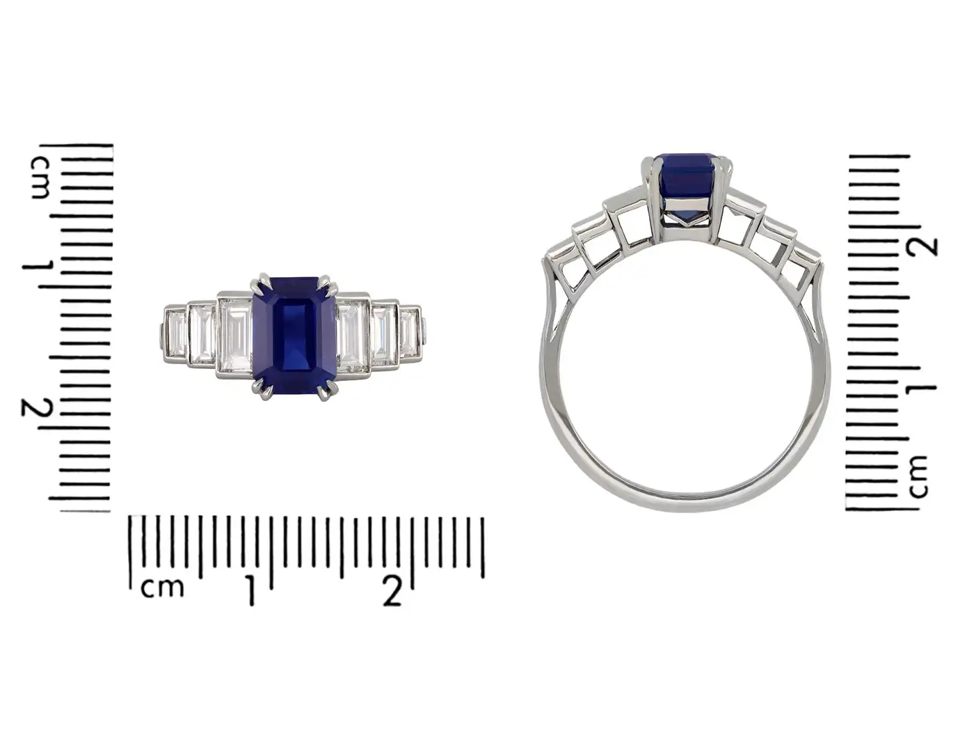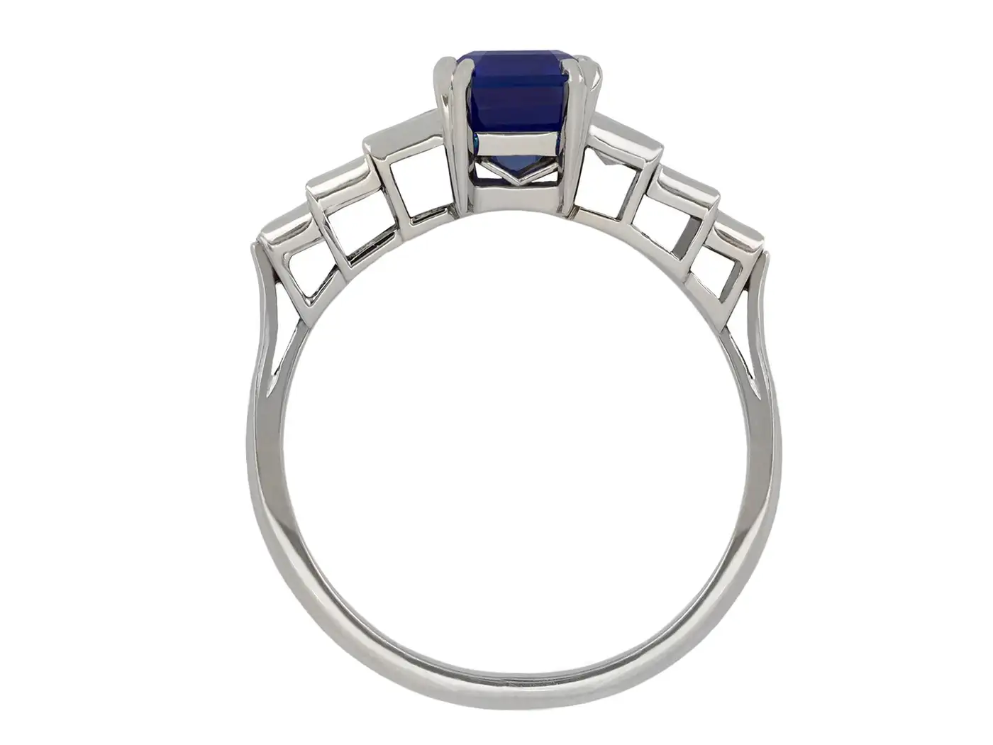 Kashmir sapphire and diamond ring. Centrally set with a rectangular emerald-cut natural unenhanced Kashmir sapphire in an open back claw setting with an approximate weight of 2.12 carats, further set with six tapered rectangular baguette cut diamonds in open back rubover settings with an approximate combined weight of 0.70 carats, to a geometric flanked solitaire design featuring curving split corner claws, a structured linear pierced gallery and square open backholing flanked by trumpeting openwork shoulders leading down to a solid tapered D-shape shank. Marked platinum, circa 1935, accompanied by Swiss Gemmological Institute (SSEF) report #123701. UK finger size M.