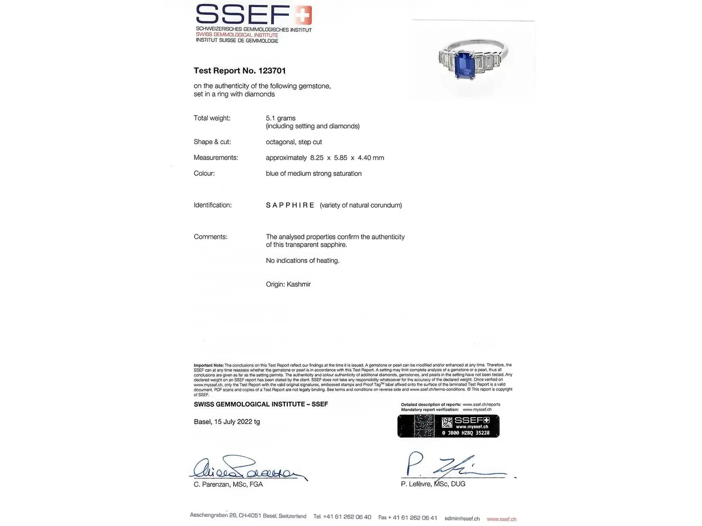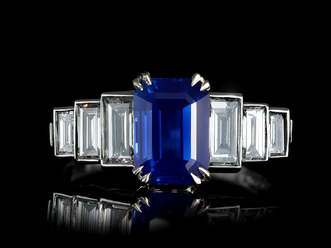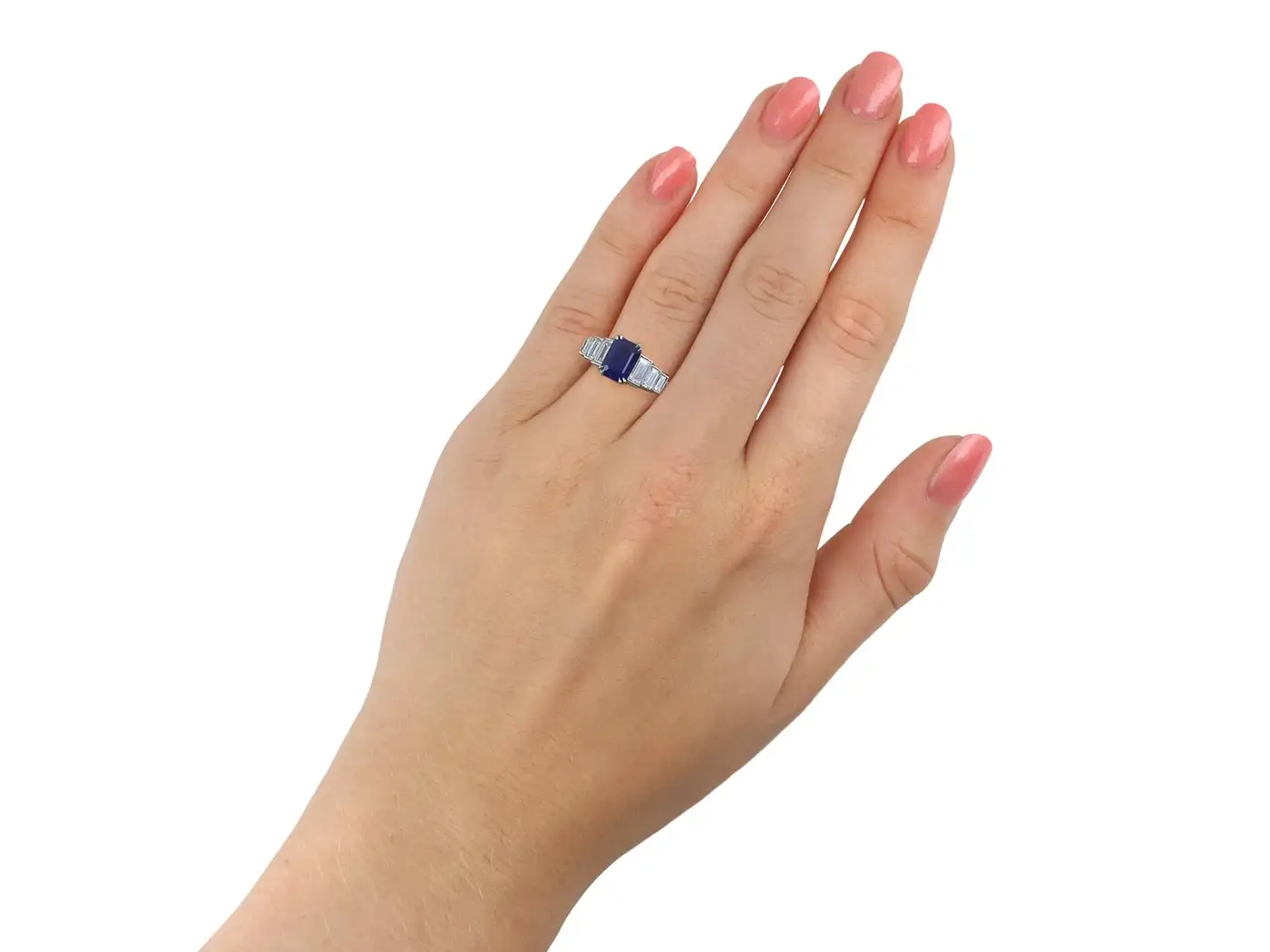 Kashmir sapphire and diamond ring. Centrally set with a rectangular emerald-cut natural unenhanced Kashmir sapphire in an open back claw setting with an approximate weight of 2.12 carats, further set with six tapered rectangular baguette cut diamonds in open back rubover settings with an approximate combined weight of 0.70 carats, to a geometric flanked solitaire design featuring curving split corner claws, a structured linear pierced gallery and square open backholing flanked by trumpeting openwork shoulders leading down to a solid tapered D-shape shank. Marked platinum, circa 1935, accompanied by Swiss Gemmological Institute (SSEF) report #123701. UK finger size M.