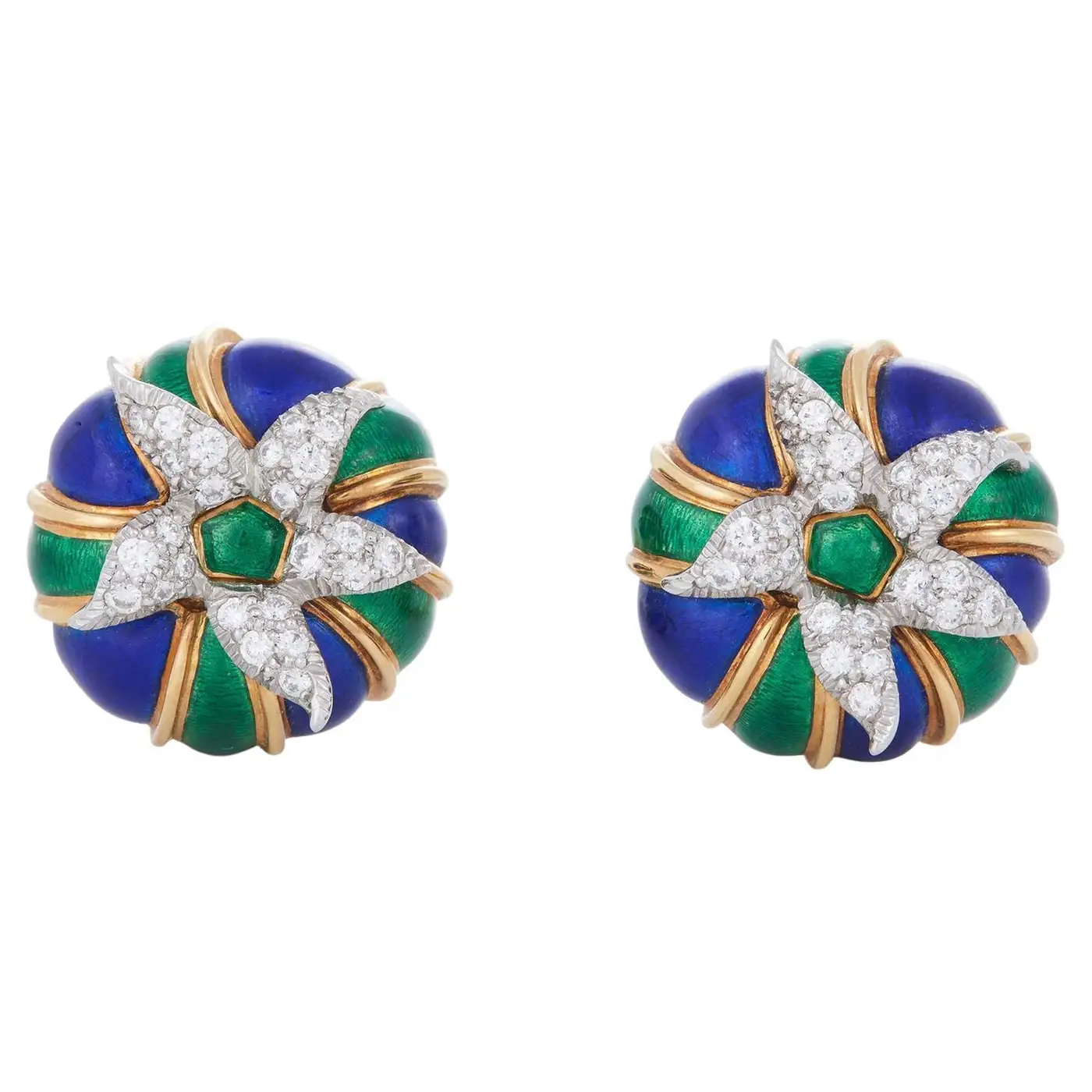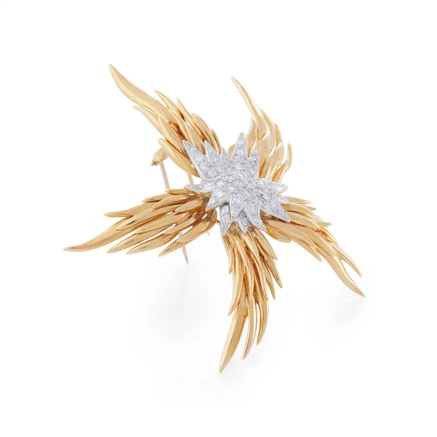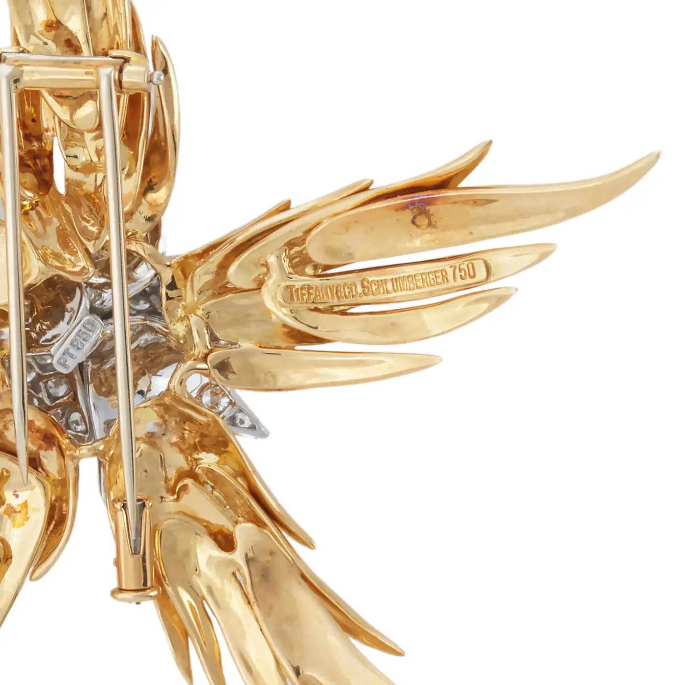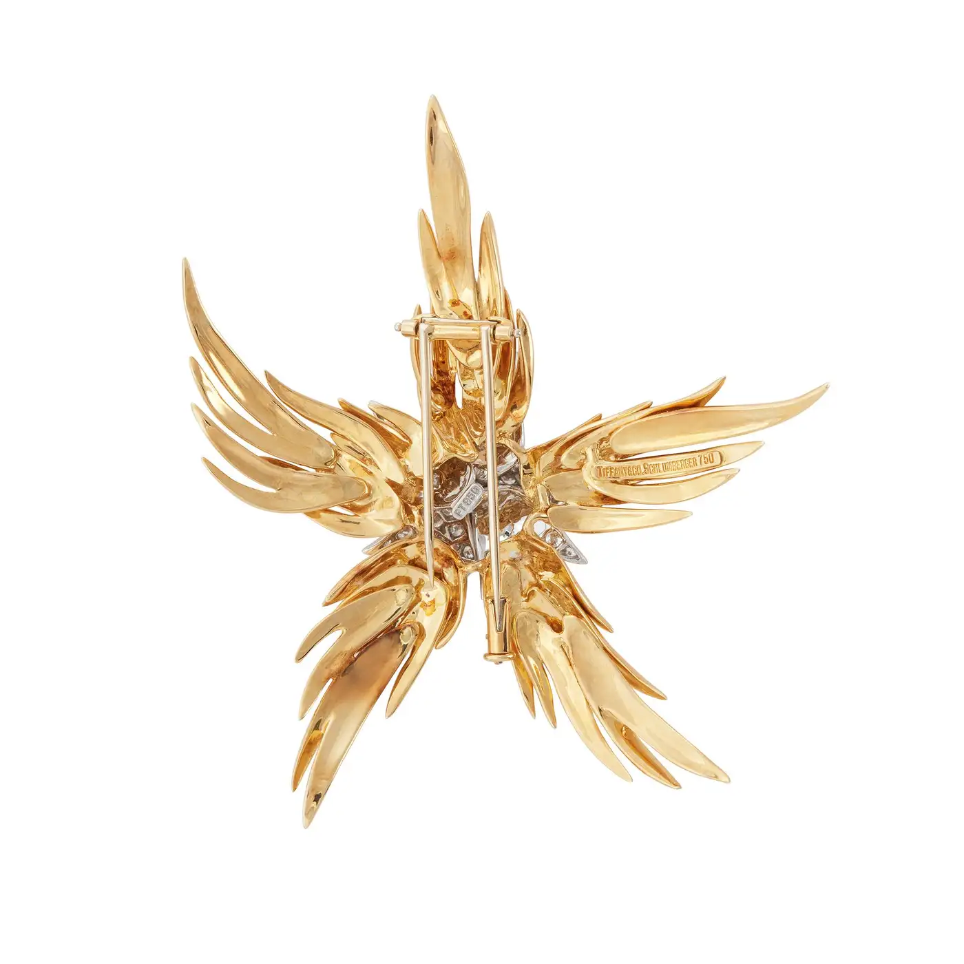 Brand: Jean Schlumberger for Tiffany & Co. Collection: Paris Flames Metal: 18k Yellow Gold, Platinum Gemstone: Diamond Condition: Excellent Wear: Consistent with age and use Weight: 38.1 grammes Measurements: 2.75 x 2.25 inches Date of Manufacture: 1990s Period: Late 20th Century