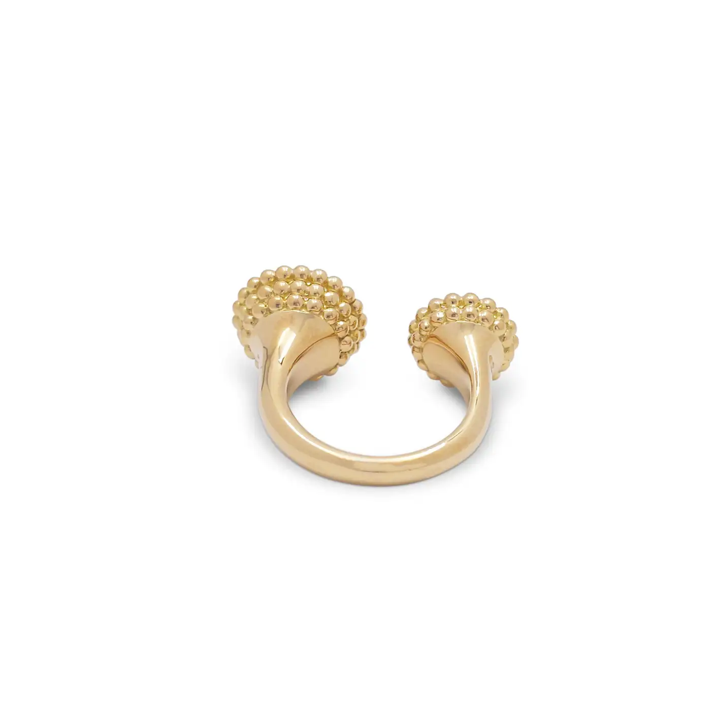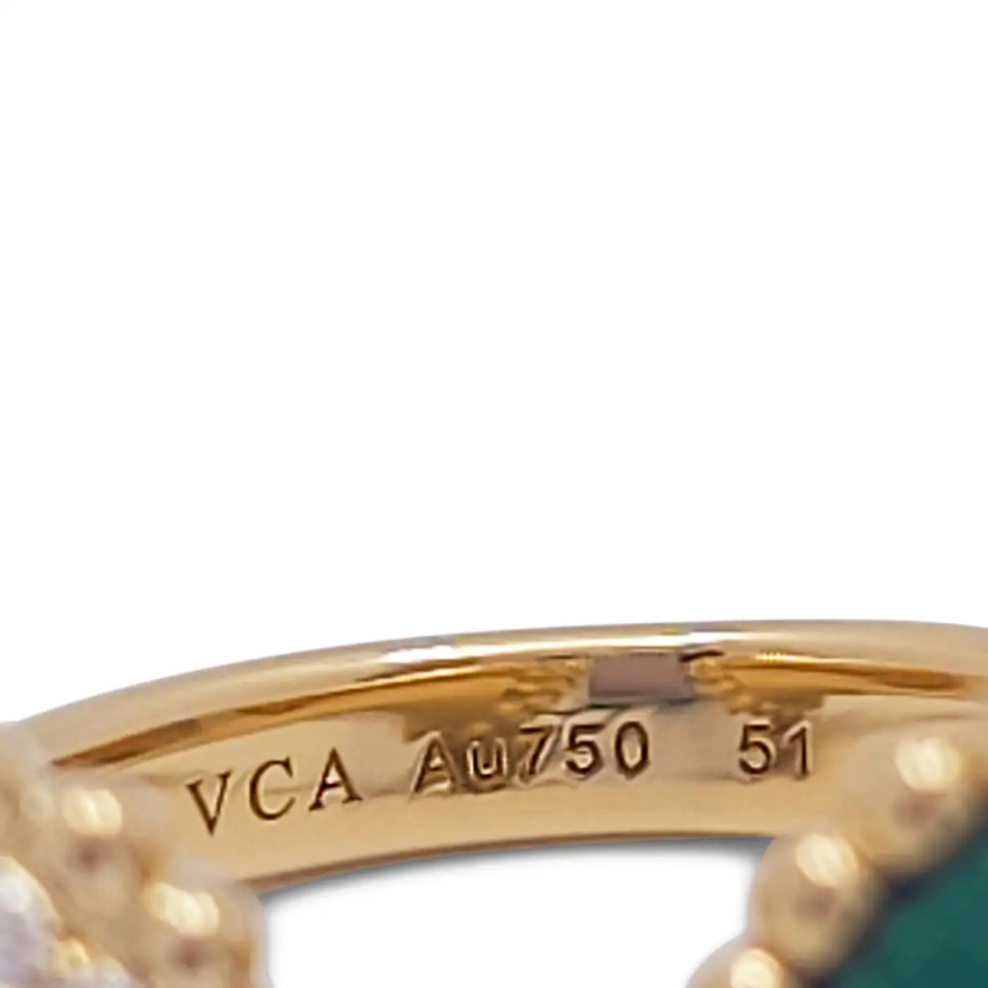 Authentic Perlée Couleurs between the finger ring crafted in 18 karat yellow gold. The split ring is set on one end with a polished cabachon malachite, the other end is set with approximately 0.35 carats of sparkling round cut diamonds. The instantly recognisable perlée border surrounds the gemstones on each end. Size 51, US 5 3/4. Signed VCA, Au750, 51 with serial number and French hallmark. Ring is accompanied by the original box and service papers. CIRCA 2010s