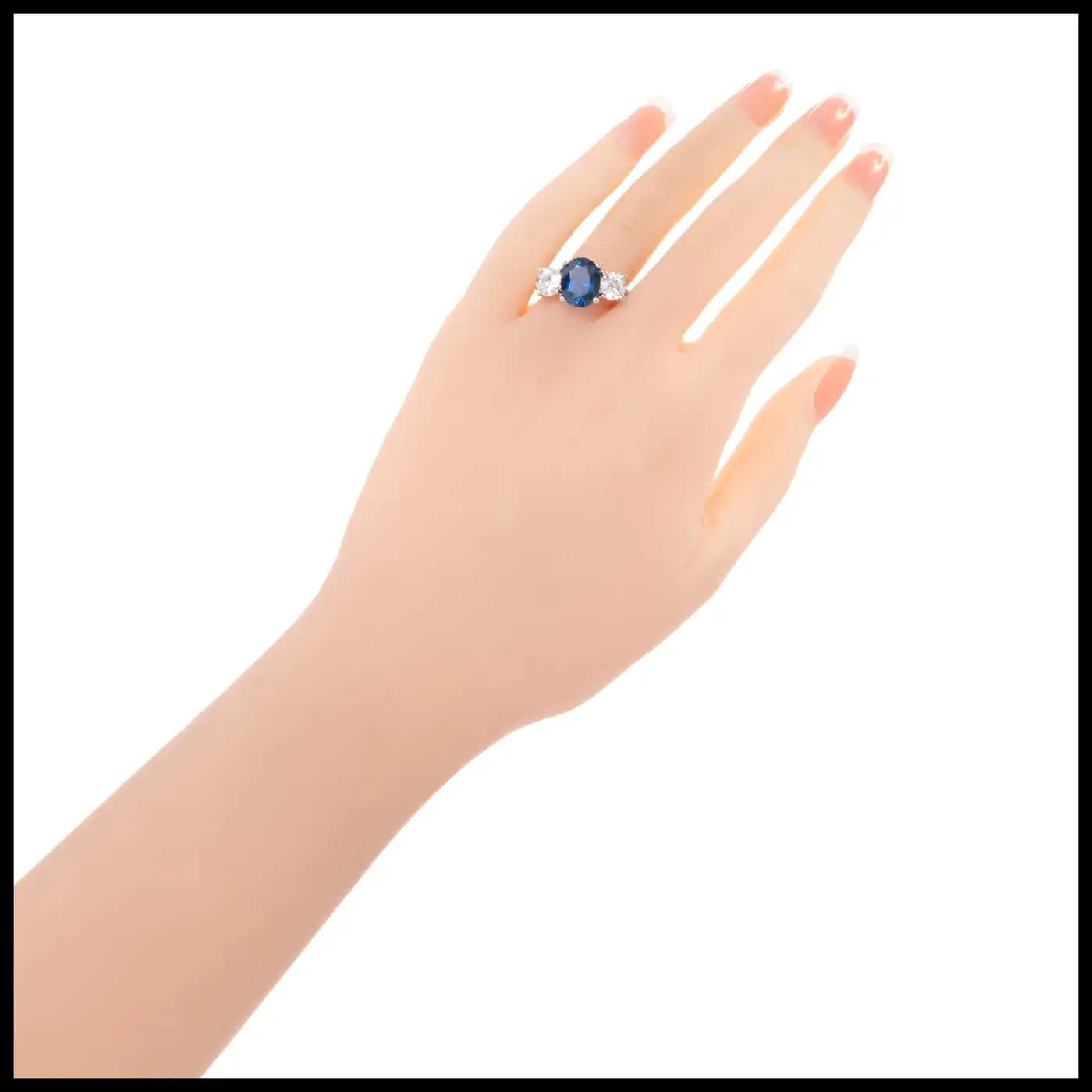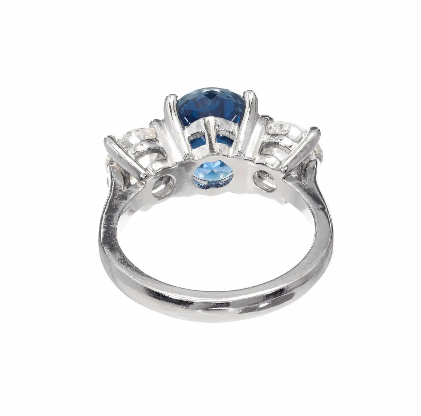 4.07 carat oval Sapphire and diamond three-stone engagement ring. Certified as natural colour simple heat only with two old European cut diamonds with raised crowns and small tables set in a platinum setting from the Peter Suchy Workshop.