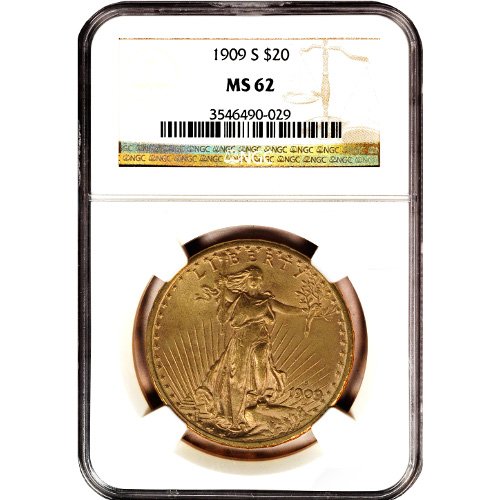 Each $20 Saint Gaudens Gold Double Eagle (MS62) has been made with .9675 oz of gold. The Lady of Liberty adorns these coins with her flowing hair and gowns. She holds a torch in one hand and an olive branch in the other. Each coin is stamped with the inscription “Liberty” as well as the year of minting. The obverse side of the coin showcases an eagle in flight above the sun. As one of America’s most majestic coin offerings, it’s no surprise why this one remains so popular with collectors.