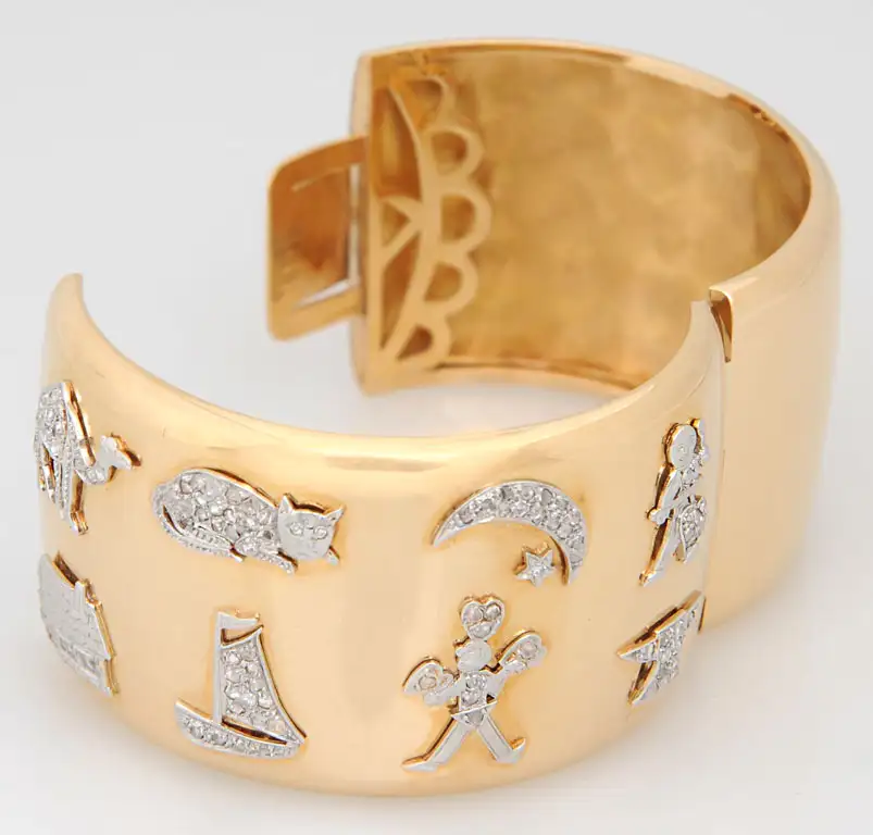 This is a wonderful marriage of 8 Deco platinum and diamond charms: Camel, Cat, Moon & Star, Musician, House, Boat, Anvil, and a Man holding Hearts (possibly a juggler). These platinum charms were put into this 18k yellow gold bangle in the 40”s.
