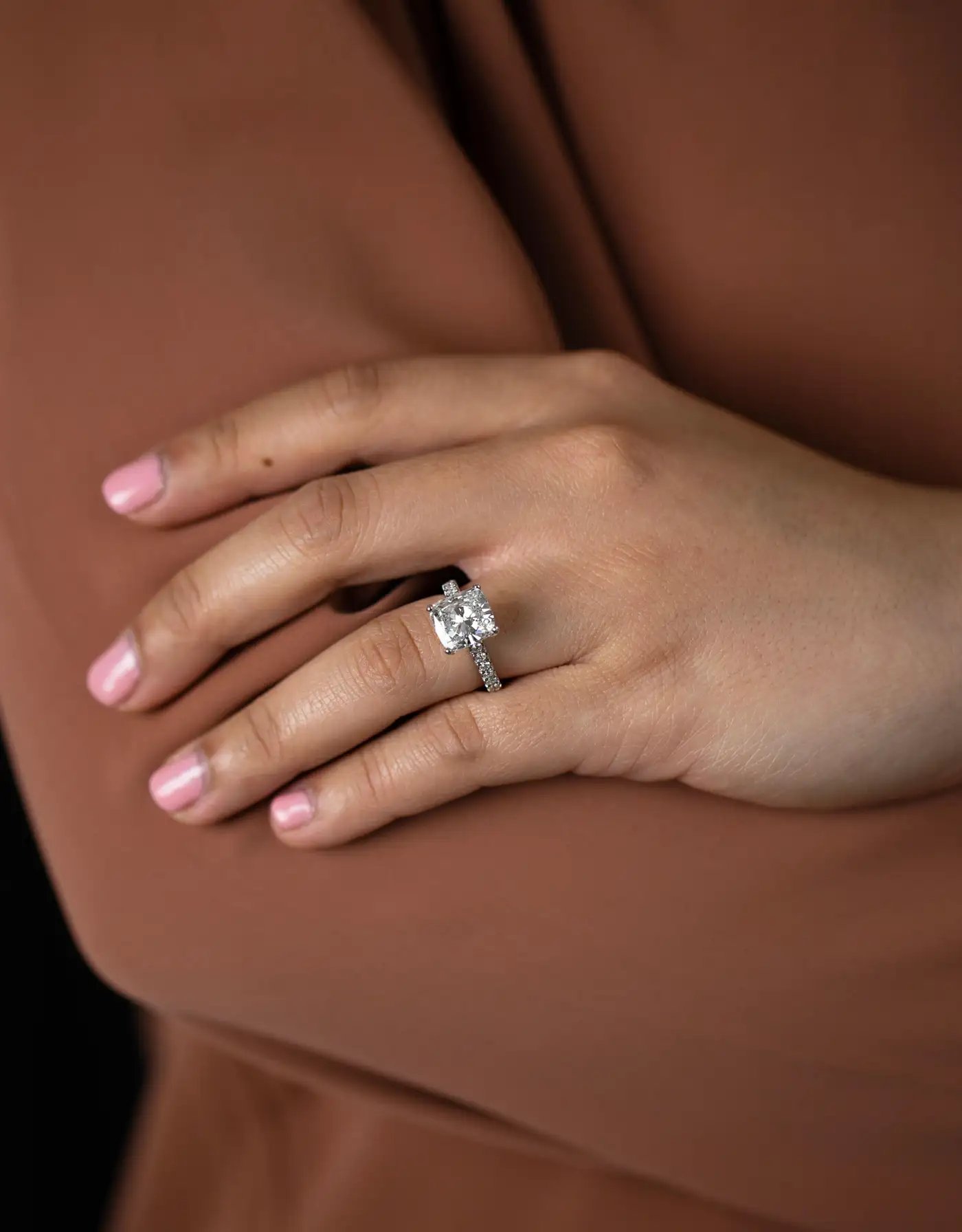 Showcasing an elegant GIA Certified cushion cut diamond weighing 3.25 carats total, G colour and SI1 in clarity, set in a platinum four prong setting. Beautifully set in a diamond encrusted shank weighing 0.50 carats total.Size 5.25 US and resizable upon request. Style available in different price ranges. Prices are based on your selection. Please contact us for more information.