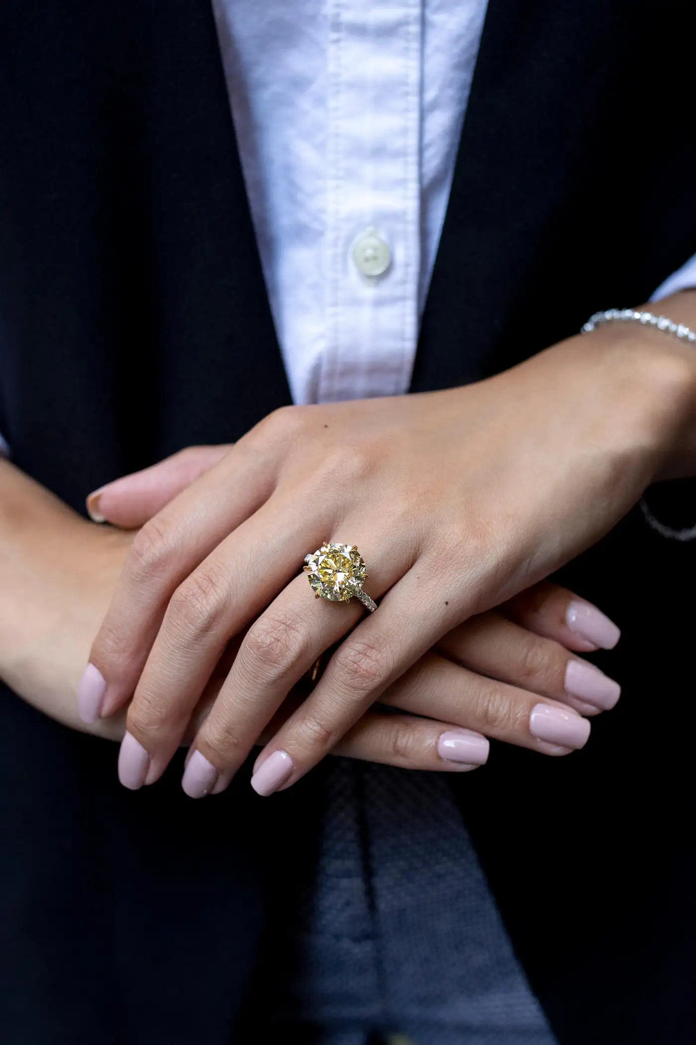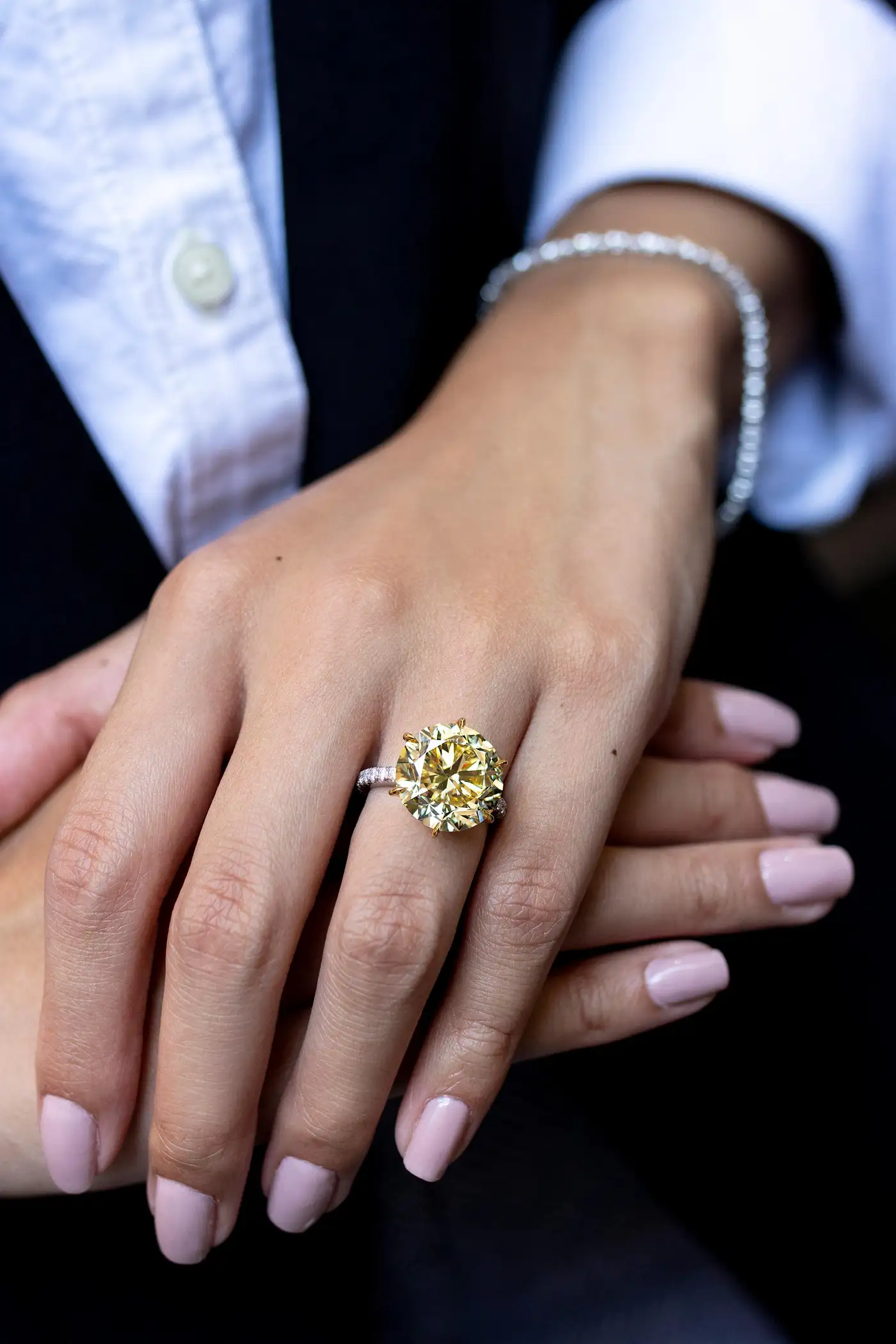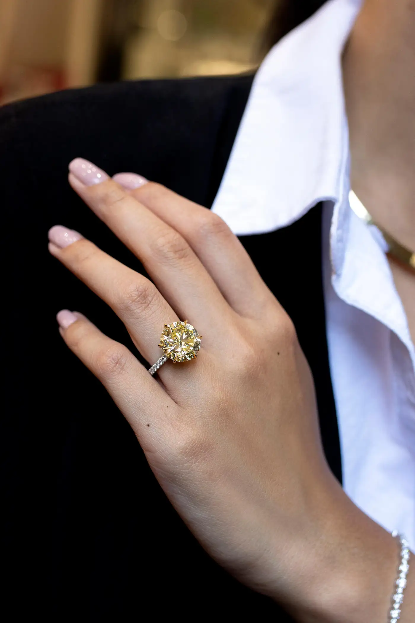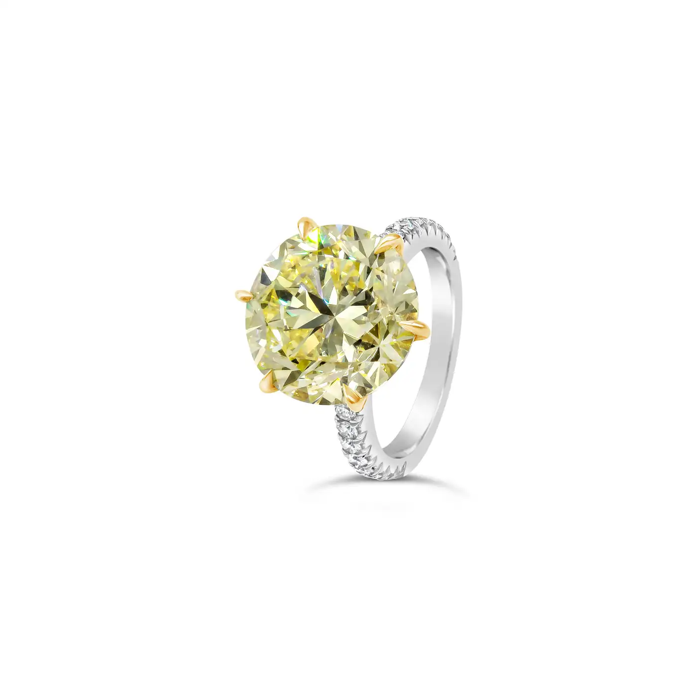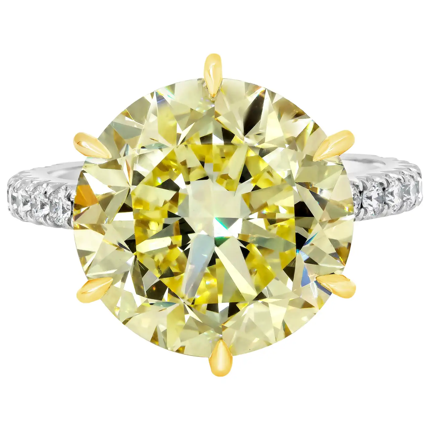 Showcases a 10.02 carat round brilliant diamond certified by GIA as Fancy Intense Yellow colour, VS1 clarity. Set in a 6 prong basket encrusted with yellow diamonds. Platinum band accented with round brilliant diamonds. Size 6.5 US (sizable upon request). Style available in different price ranges. Prices are based on your selection of the 4C’s (Carat, Colour, Clarity, Cut). Please contact us for more information.