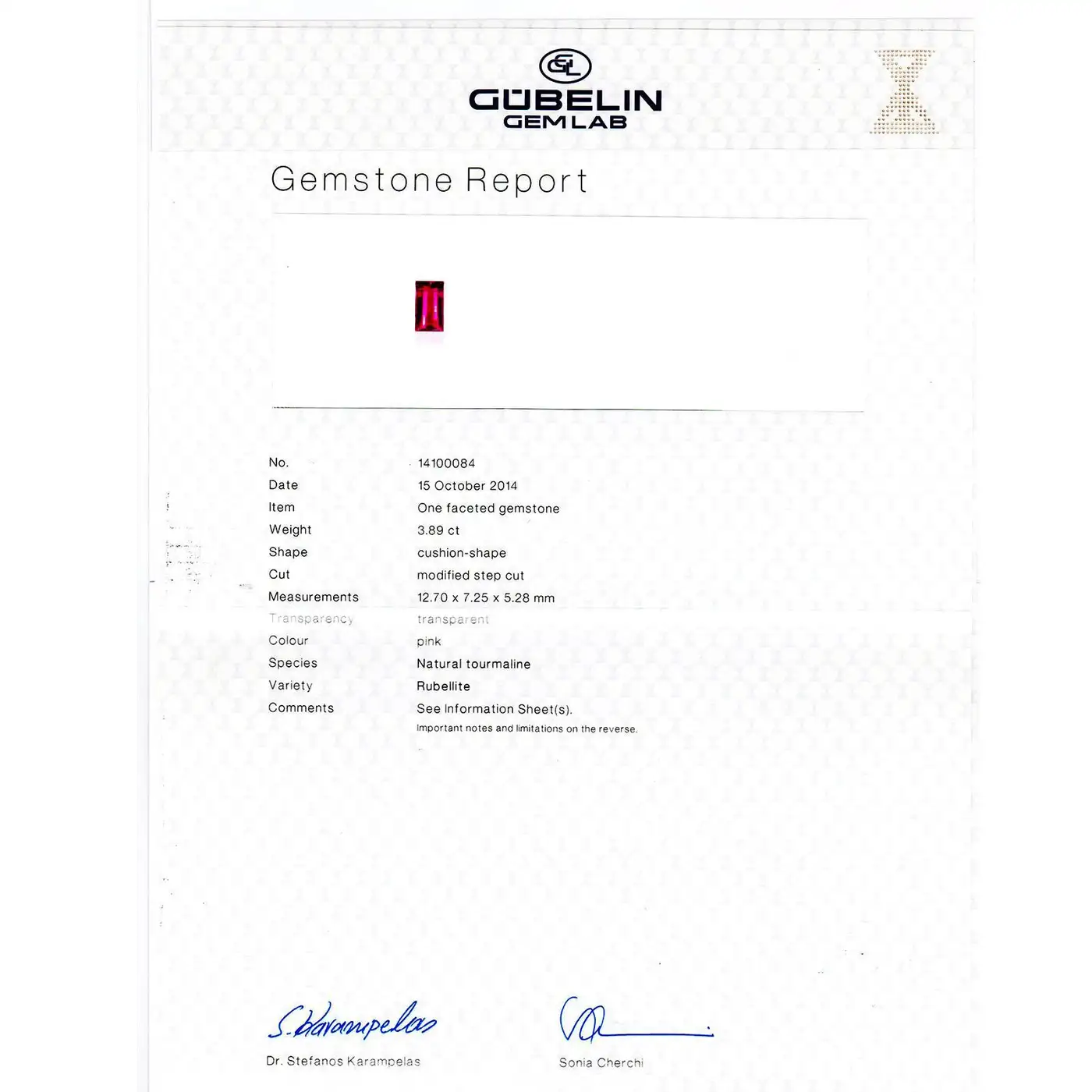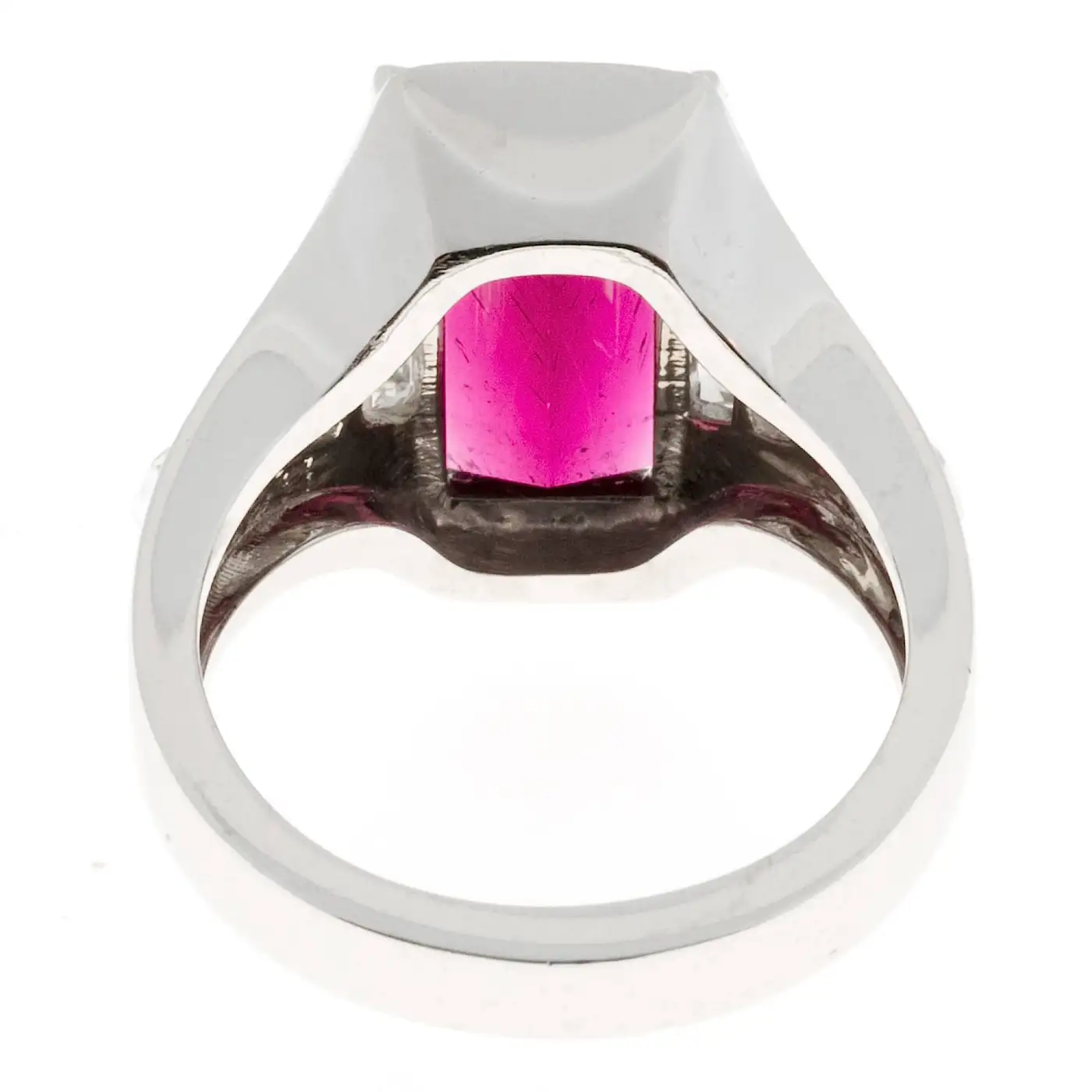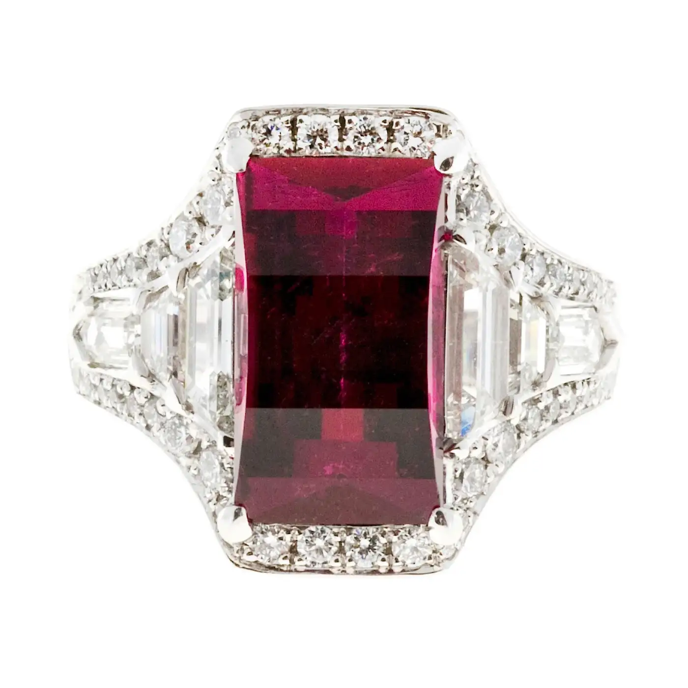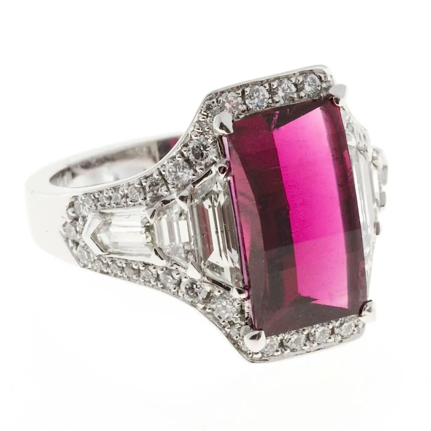 1 cushion cut custom cut pink red Tourmaline, approx. total weight 3.89cts, VS, 12.70 x 7.25 x 5.25mm, Gubelin certificate # 14100084 Size 6.25 and sizable 4 trapezoid diamonds, approx. total weight .50cts, G, VS – SI 50 round diamonds, approx. total weight .50cts, E – F, VS 2 bullet diamonds, approx. total weight .25cts, F, VS Platinum Tested: Platinum Stamped: Plat 12.1 grammes Width at top: 11.54mm Height at top: 7.44mm Width at Bottom: 3.12mm