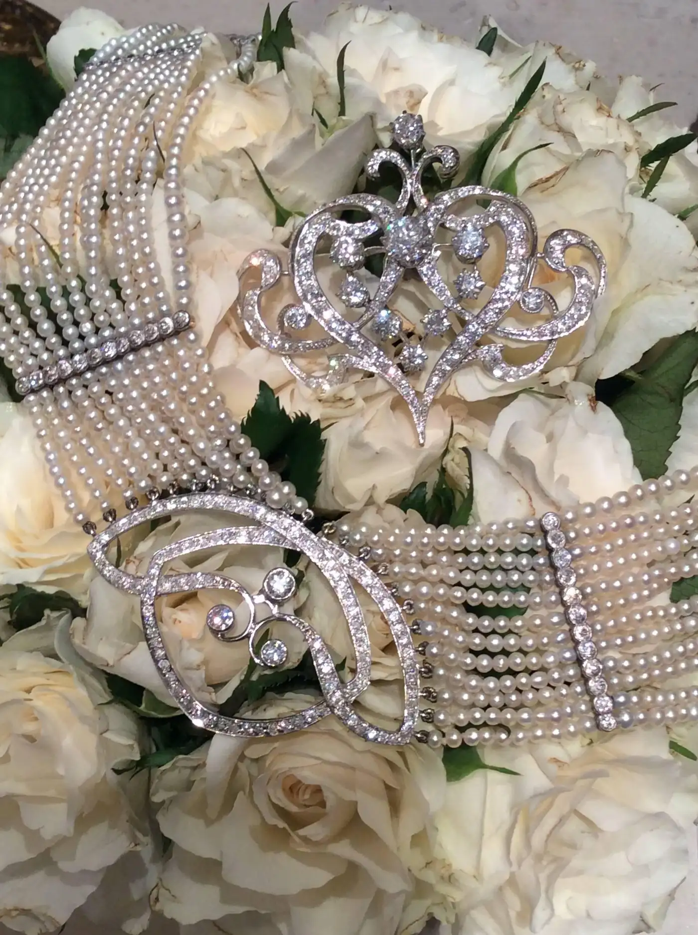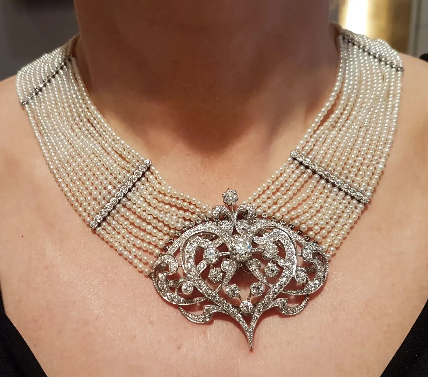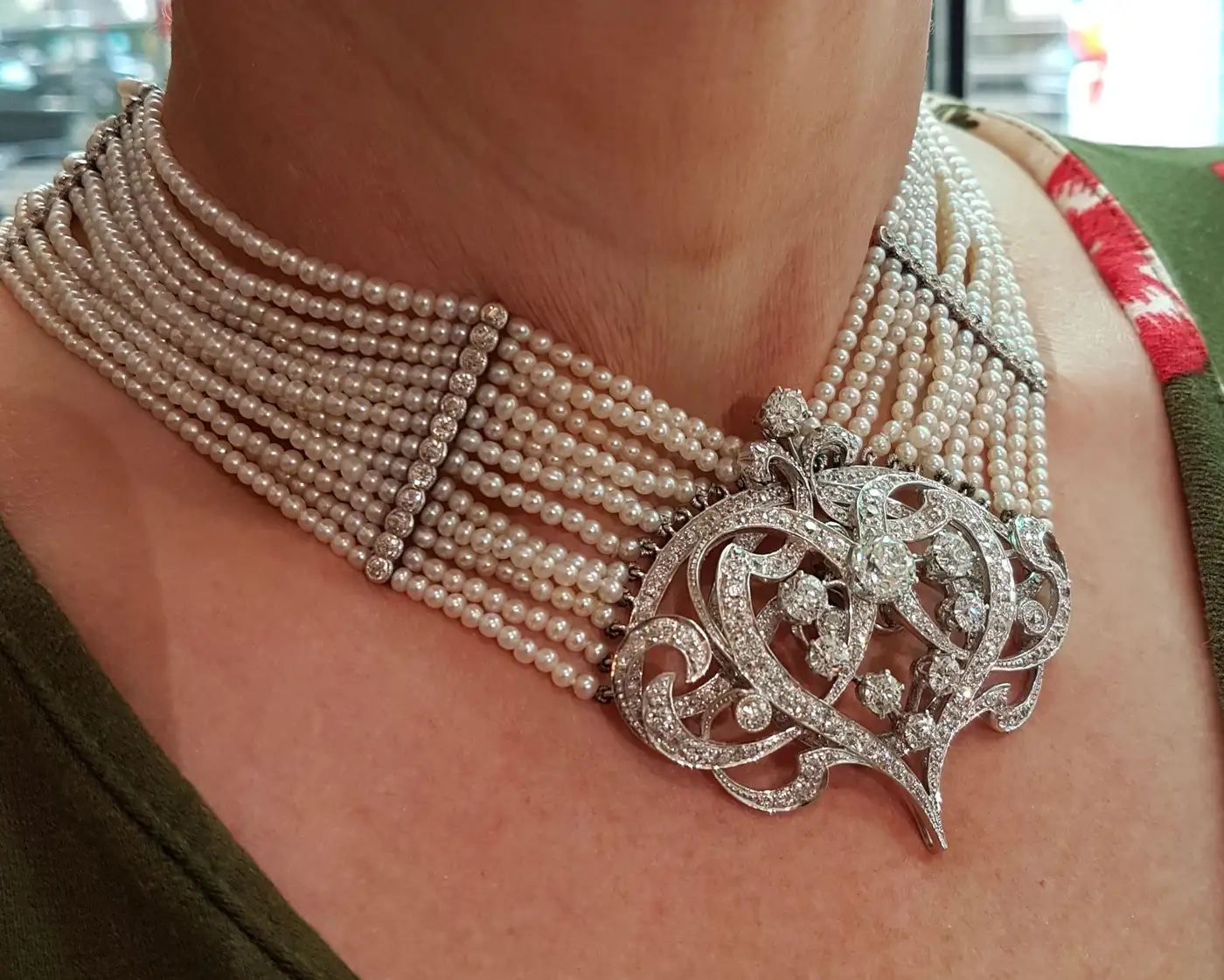 Stunning choker composed of 12 strands seed pearls (circa 2,5 mm to 3 mm) well matched, of cream body colour with faint rose overtones. They are of good quality and lustre. The strands are divided by finely wrought partitions made of platinum and gold with old European-cut diamonds, G-H, VS-SI. In front the choker is accented by a beautiful large ornament made of platinum, Gold and old European-cut diamonds, G-H, VS. The top part of the ornament can be removed.