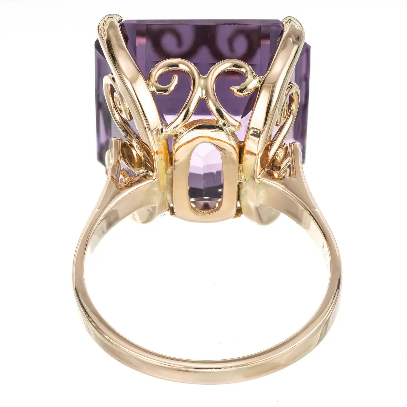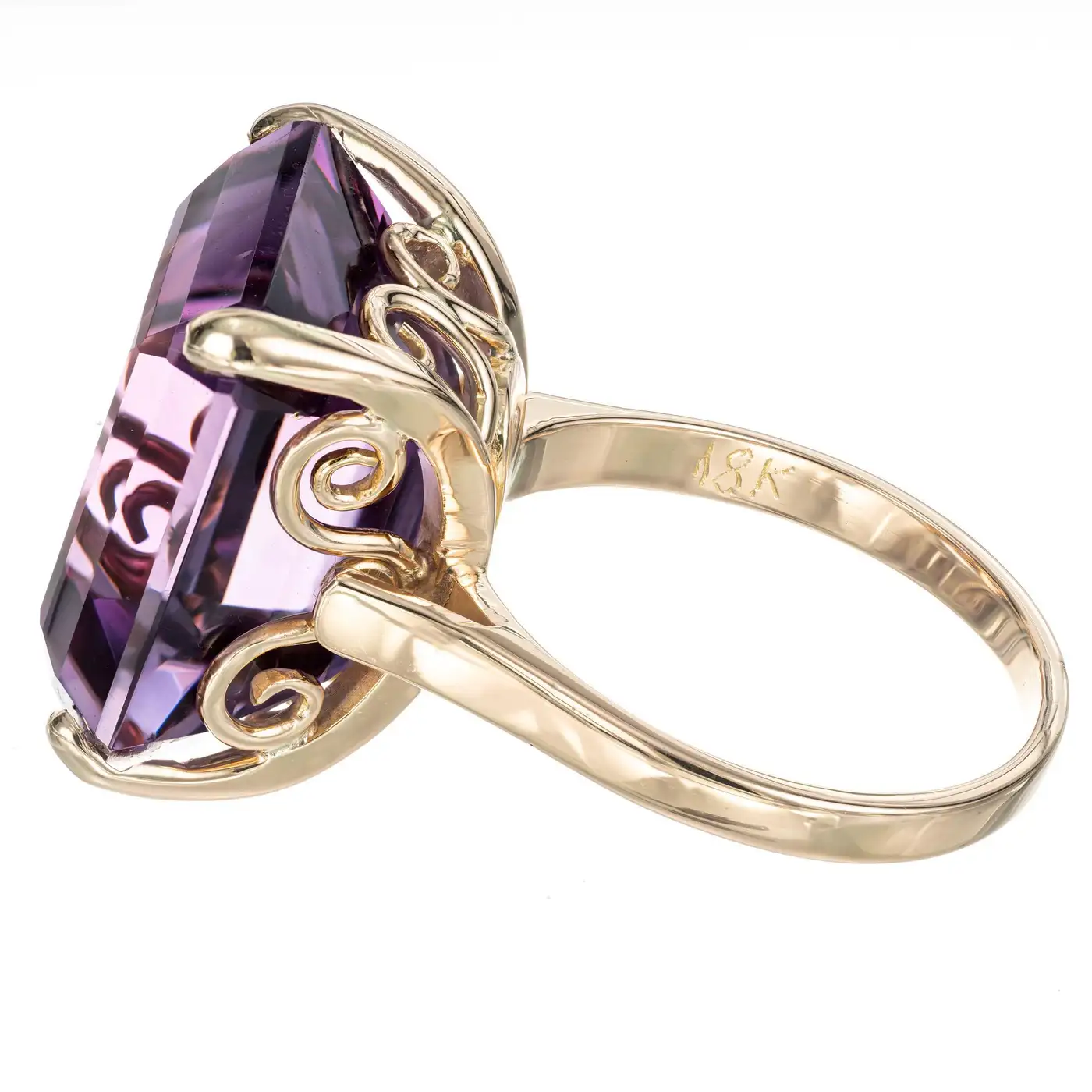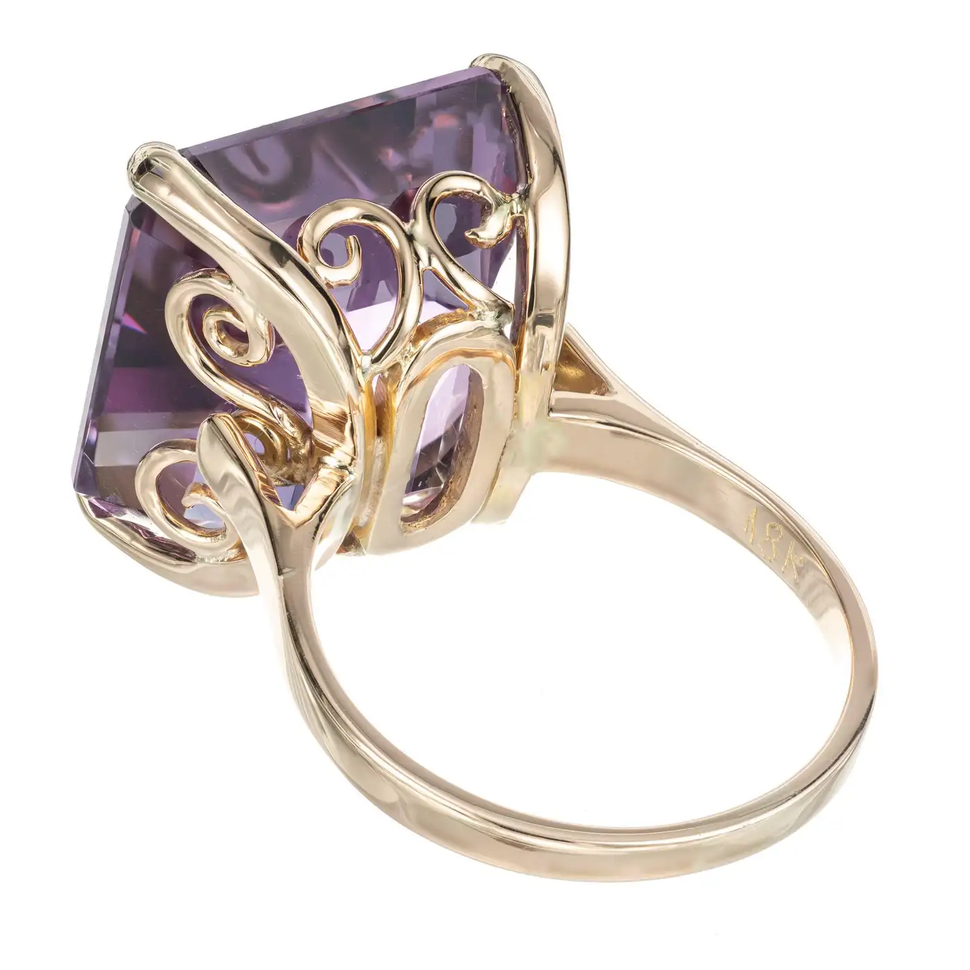 1940”s square amethyst cocktail ring. 17.00cts amethyst set in a handmade 18k yellow gold setting. 1 Well-polished 16.5 x 16mm square bright purple Amethyst, approx. total weight 17.00cts Size 7 and sizable 18k yellow Gold 9.1 grammes Stamped: 18k Width at top: 16.3mm Height at top: 11mm Width at bottom: 2mm.