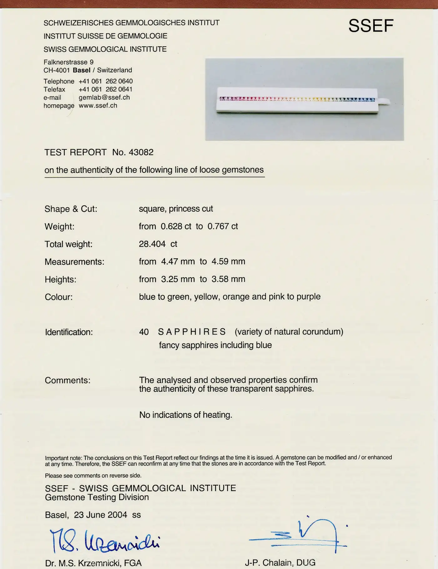 Featuring 40 Fancy Sapphires of Blue to Green, Yellow, Orange and Pink to Purple Square Princess-cut Natural Corundum, Sapphires; no indication of heat treatment. Measuring approx: 4.47mm – 4.59mm; 3.25mm – 3.58 high; approx. total weight: 28.404 Carat. Approx. 7.25” (18.3 cm) long. Beautifully Hand-crafted in Platinum. A must have heirloom…Chic, Classic and Timeless…for you to Enjoy!