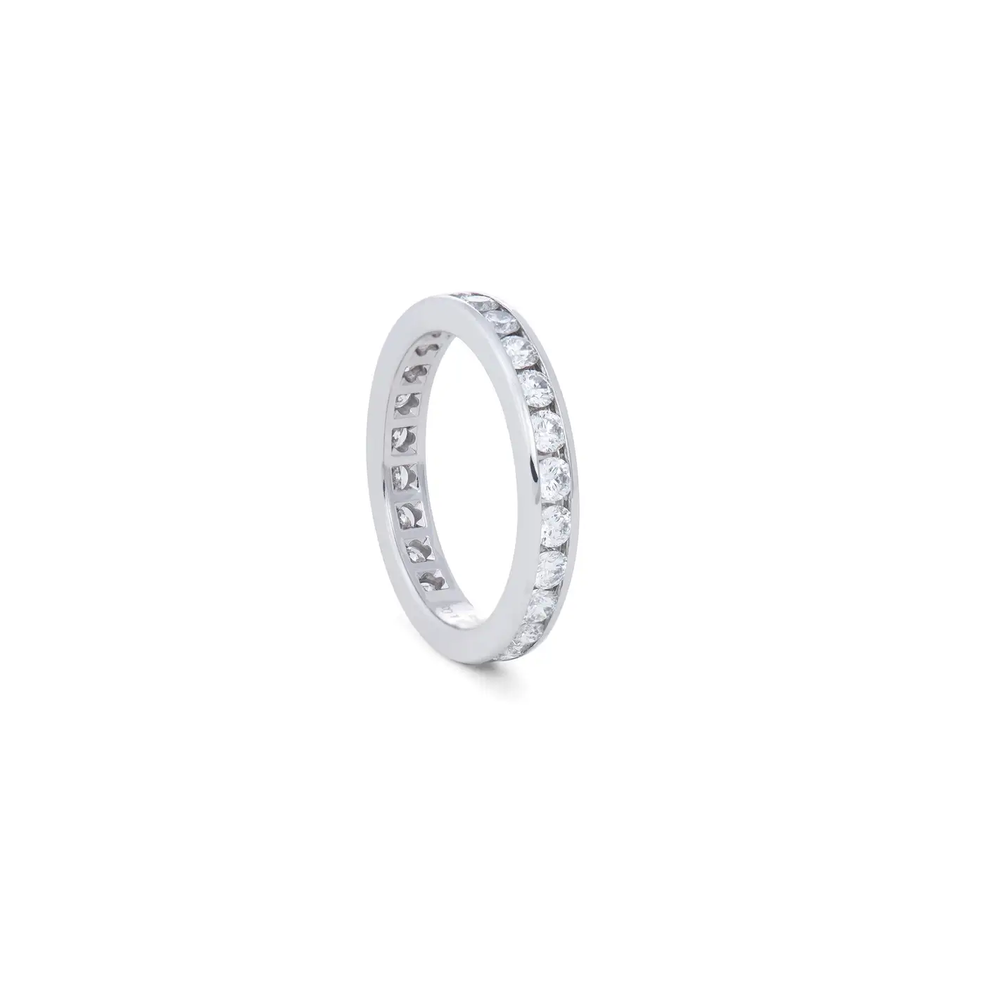 Authentic Tiffany & Co. Tiffany Setting wedding band crafted in platinum. The channel set eternity band features 24 gorgeous round brilliant cut diamonds of an estimated 0.85 carats total weight and measures 3mm in width. Size 4 1/2. Signed Tiffany & Co., PT950. Ring is presented with a Tiffany & Co. pouch, and original purchase receipt. CIRCA 2010s