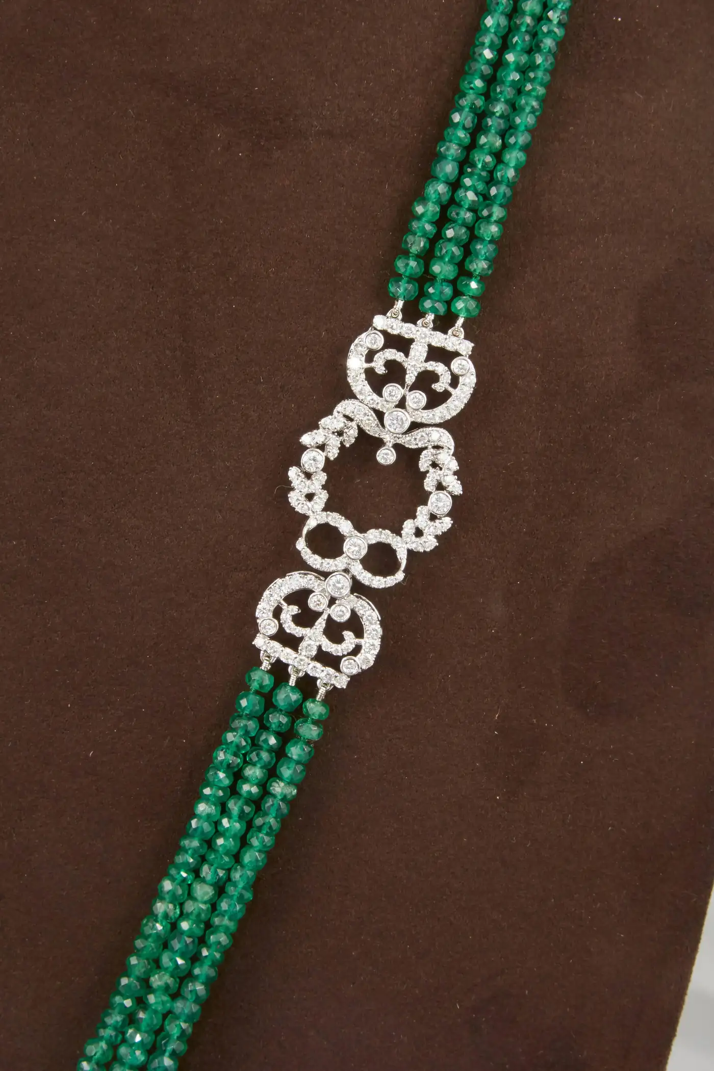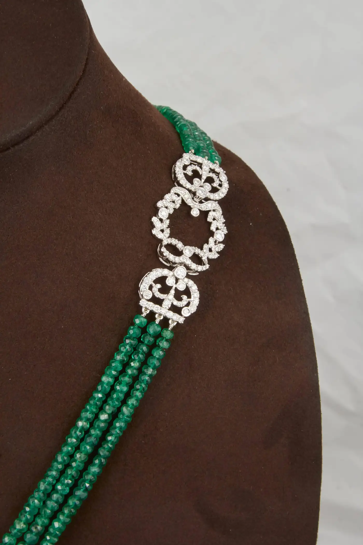 A fabulous and unique piece! Over 300 carats of fine green emeralds, 16.26 carats of F/G VS diamonds. This piece can be worn to a black tie affair or more casually. A beautiful pop of colour along with the sparkle from the emeralds and diamonds. The diamond pieces are made to have a royal and vintage feel.