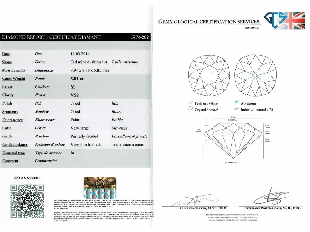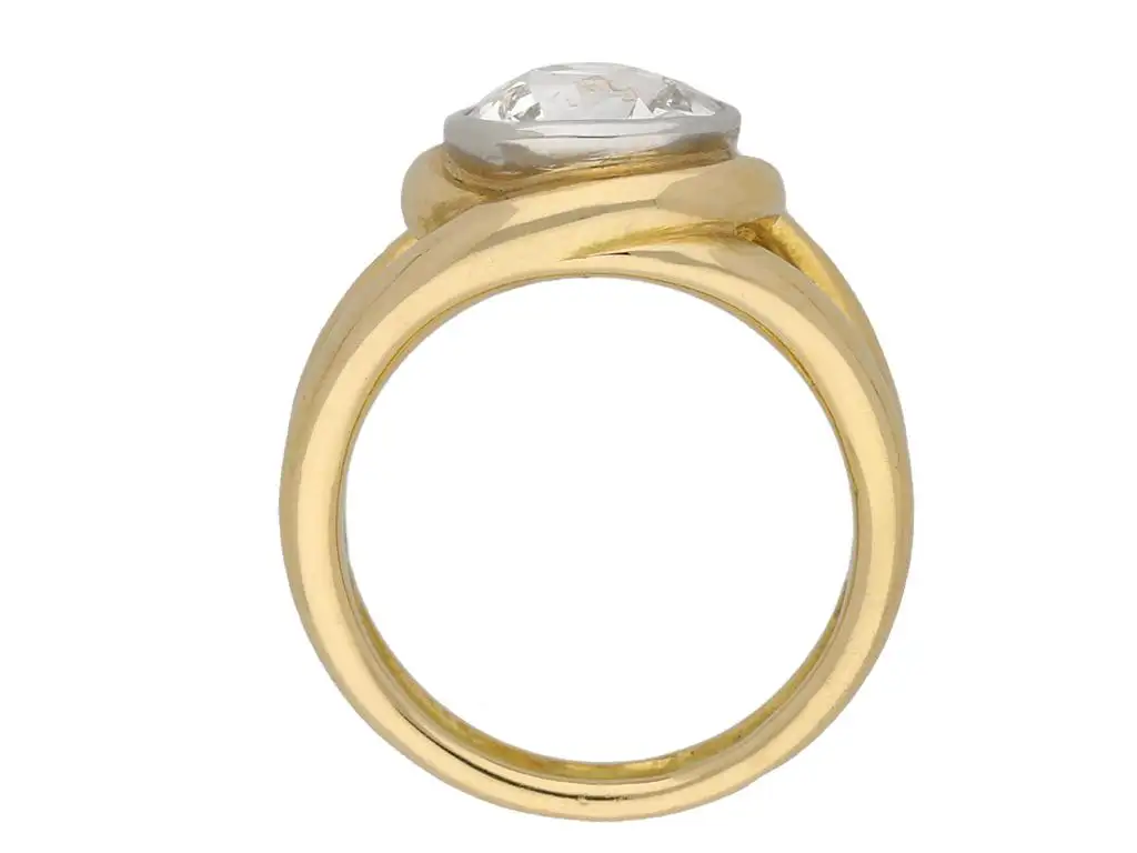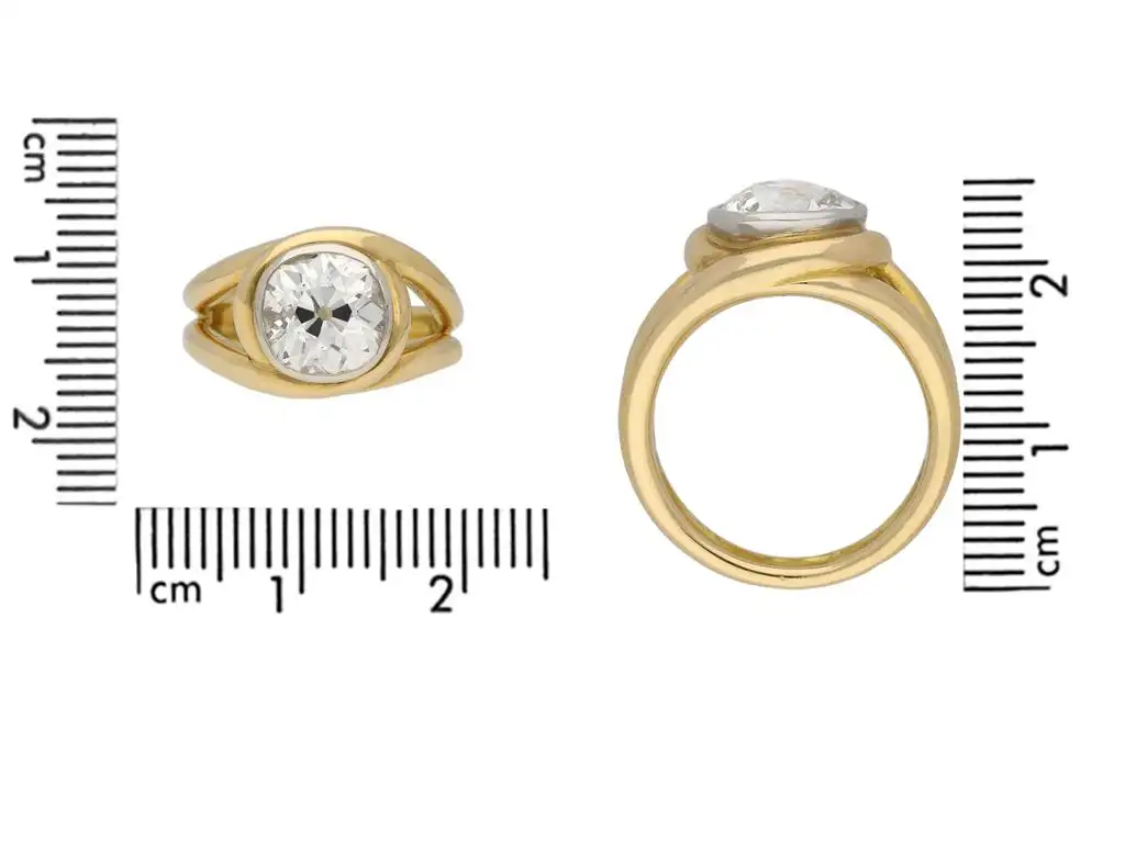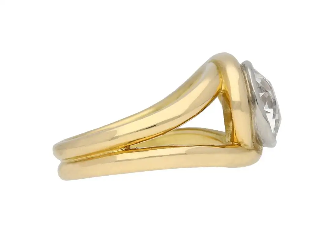 Vintage solitaire cushion shape old mine diamond ring. Set with one central cushion shape old mine diamond, M colour, VS2 clarity, with an approximate weight of 3.01 carats, in an open back white gold rubover collet setting, with open backholing, flanked by split shoulders which wrap around the centre stone in opposing directions, and on a double yellow gold round shank. Marked 18 carat yellow and white gold, French, circa 1950, accompanied by Gemological Certification Services report #5774-262.