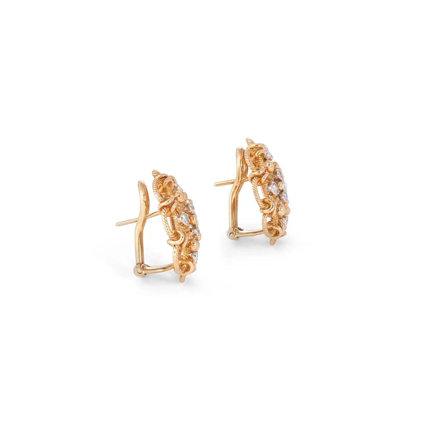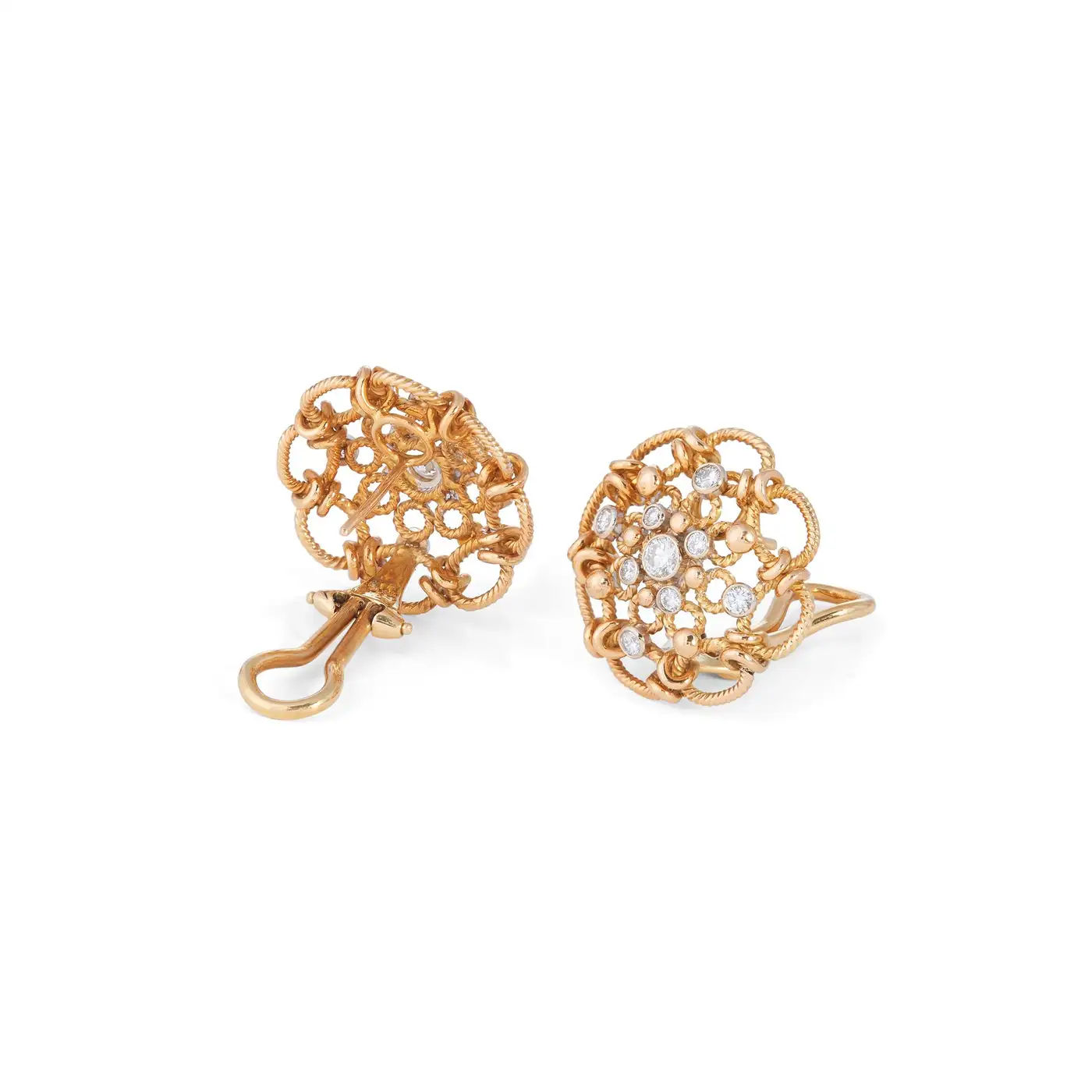 A charming pair of vintage earrings crafted in 18 karat yellow gold. The rope textured gold is arranged in a woven design of circles and knots and studded with bezel set round diamonds of an estimated 0.50 carats total weight. The circular earrings measure 0.87 inches in diameter with posts and omega backs for pierced ears. CIRCA 1980s