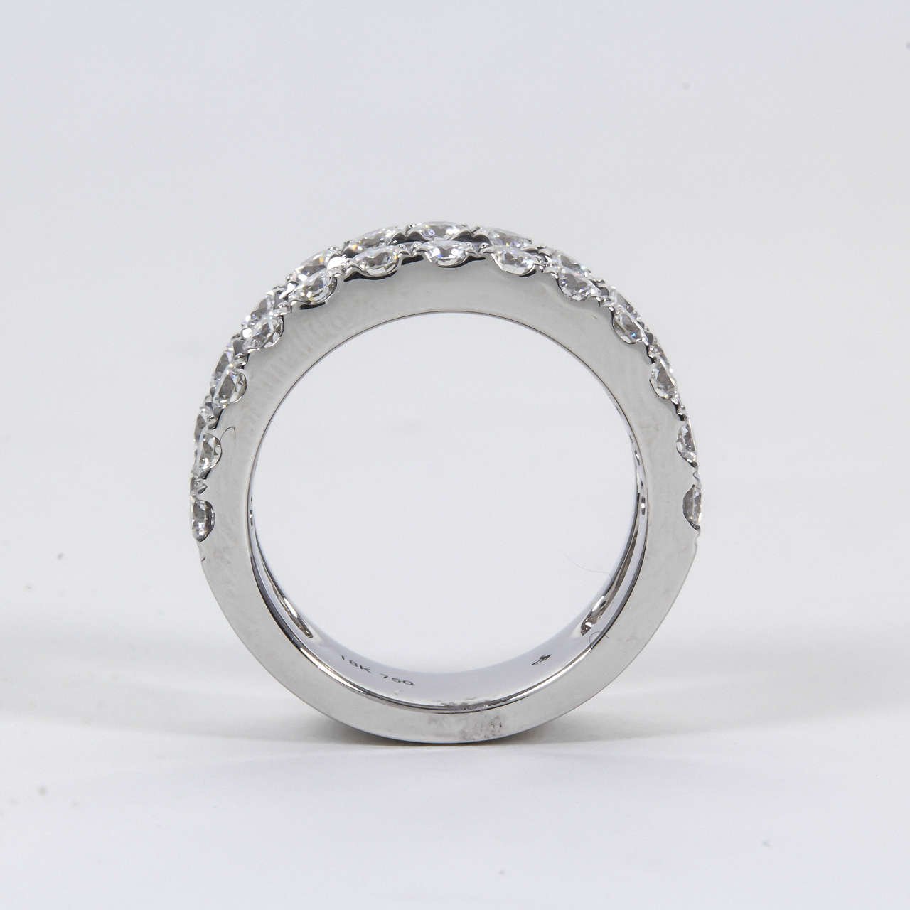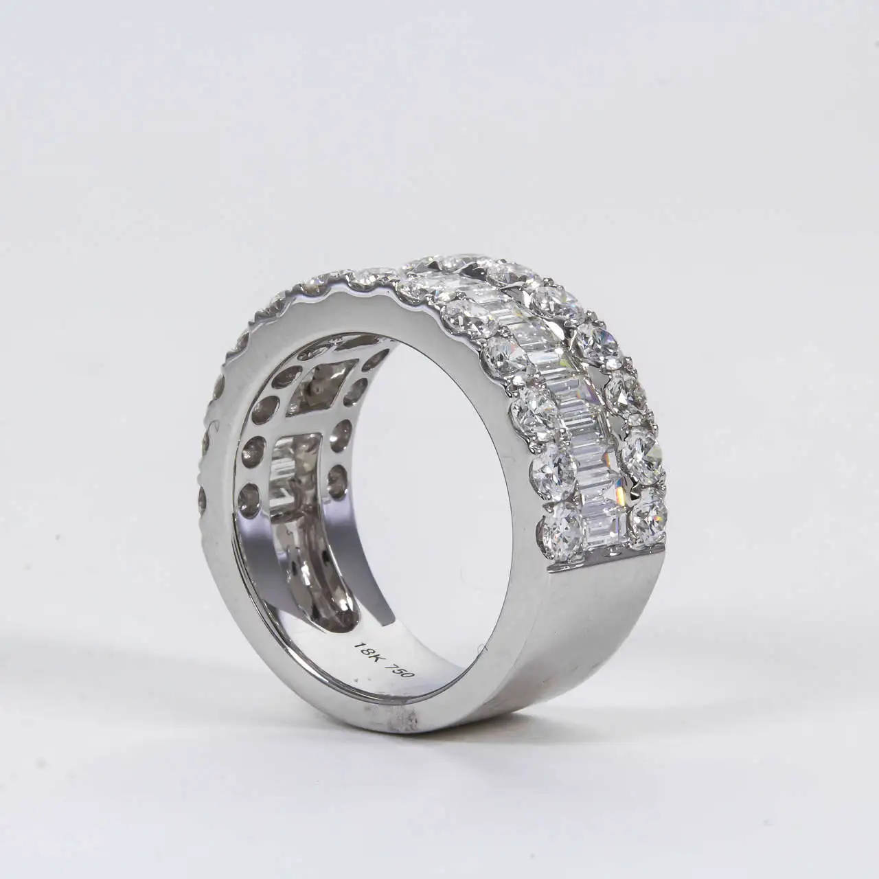 A stunning ring! 3.79 carats of extremely brilliant F/G colour VS clarity round and baguette cut diamonds set in 18k white gold. Approximately 9.5 mm wide. Currently a size 6.5 — can be sized to any finger size. A perfect band for everyday or evening use.